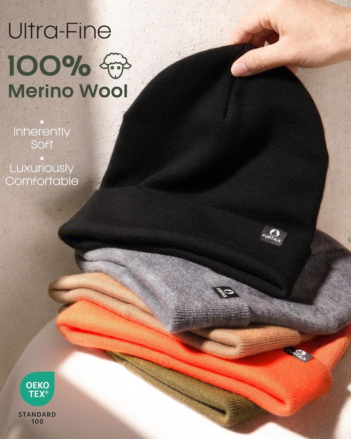 FURTALK 100% Merino Wool Beanie Hat for Men Women Warm Winter Hat Double Layer Knitted Beanies(Black)
