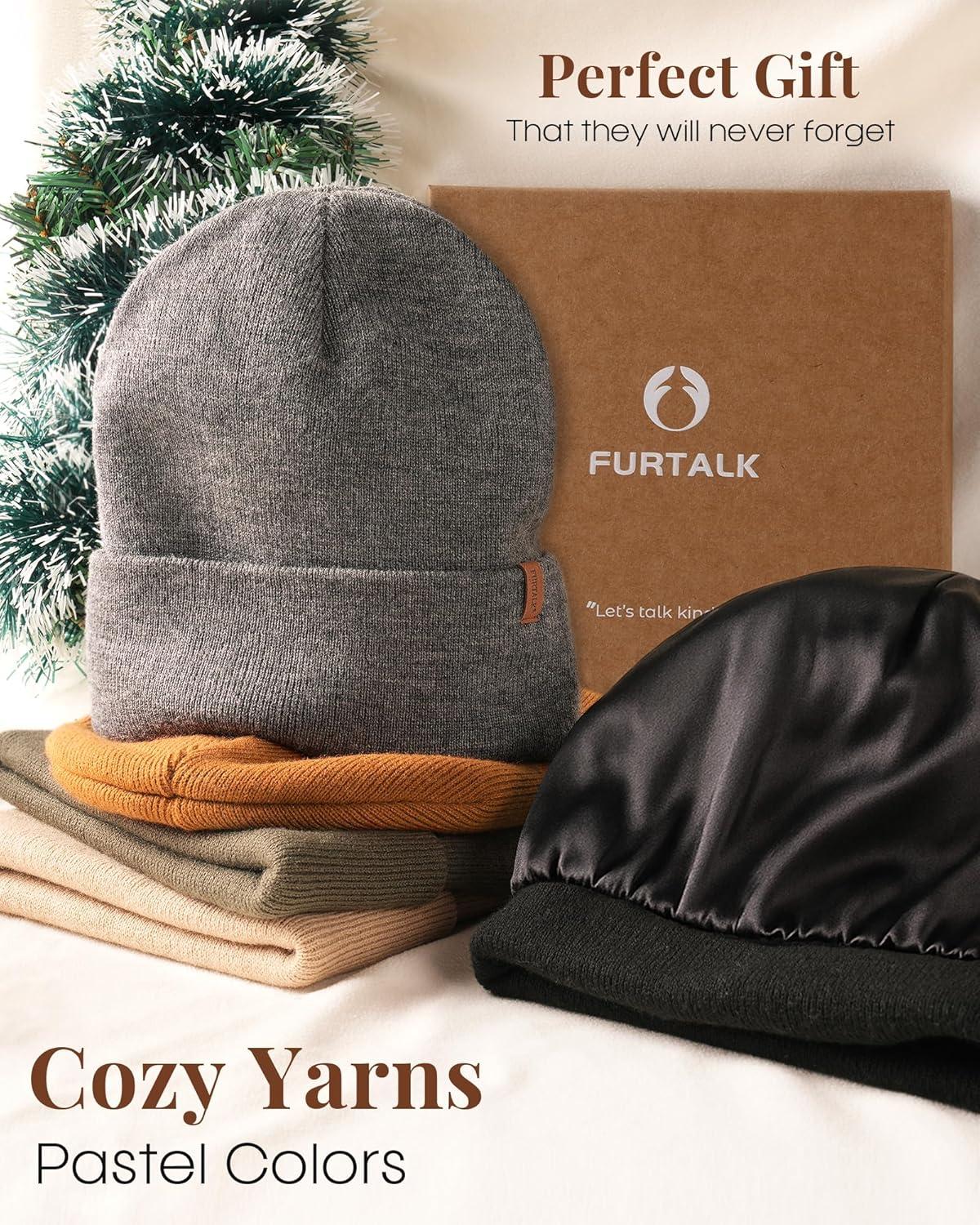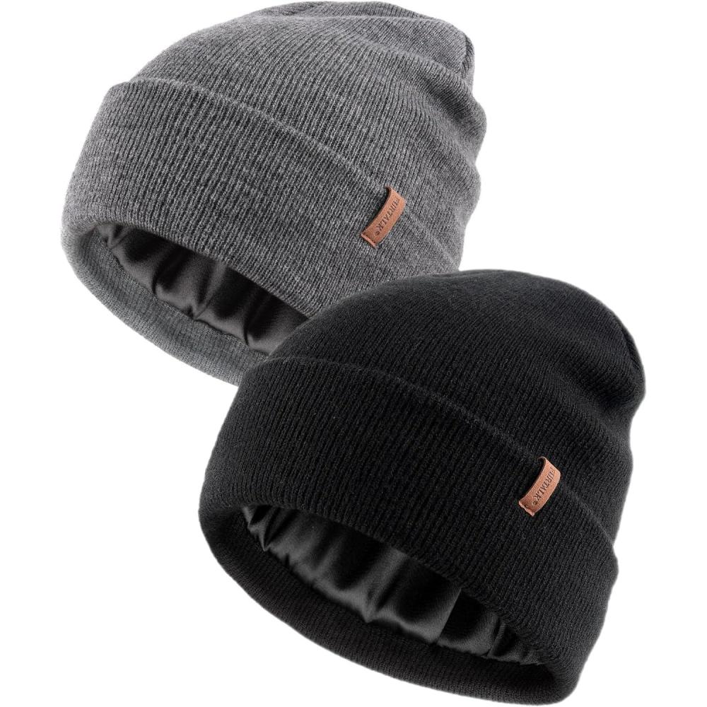 FURTALK 2 Pack Satin Lined Beanie for Men Women Acrylic Winter Hats Warm Silky Skull Cap(Black+gray)