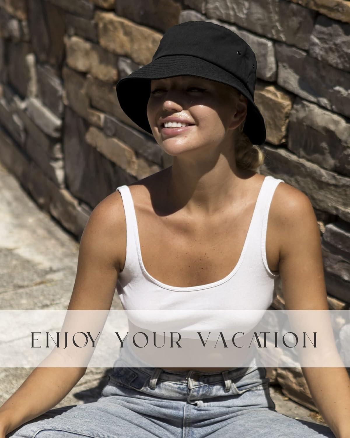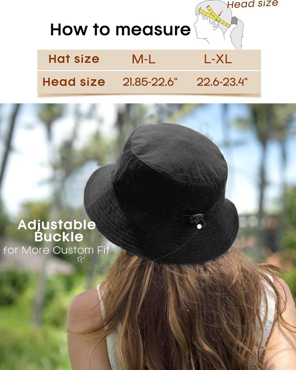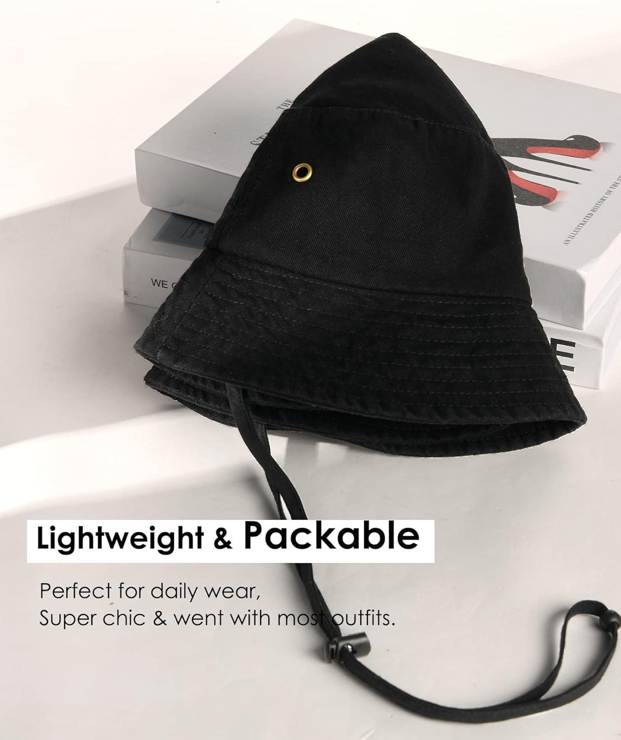 FURTALK Bucket Hats for Women Washed Cotton Packable Summer Beach Sun Hats Bucket Hat with Strings for Travel(Black)