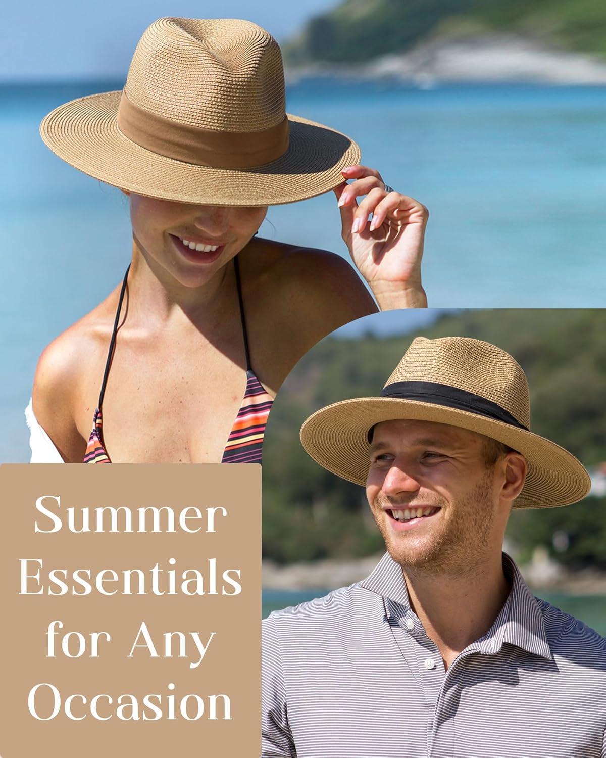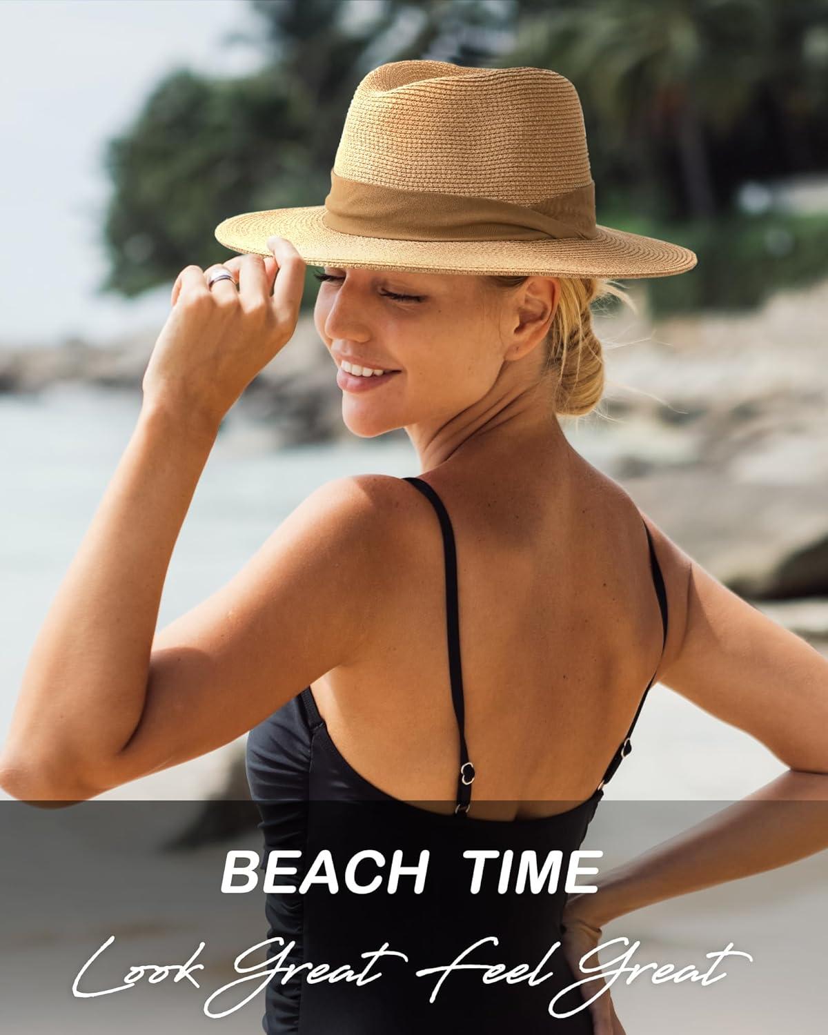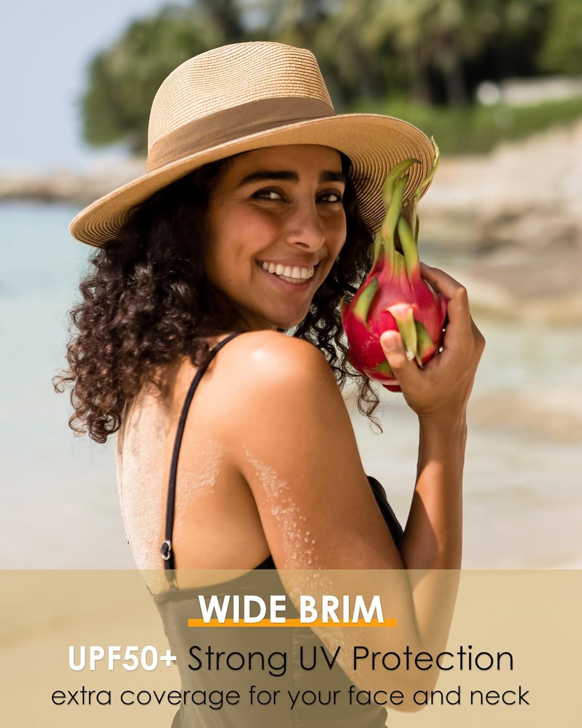 FURTALK Panama Hat Sun Hats for Women Men Wide Brim Fedora Straw Beach Hat UV UPF 80+(Khaki)