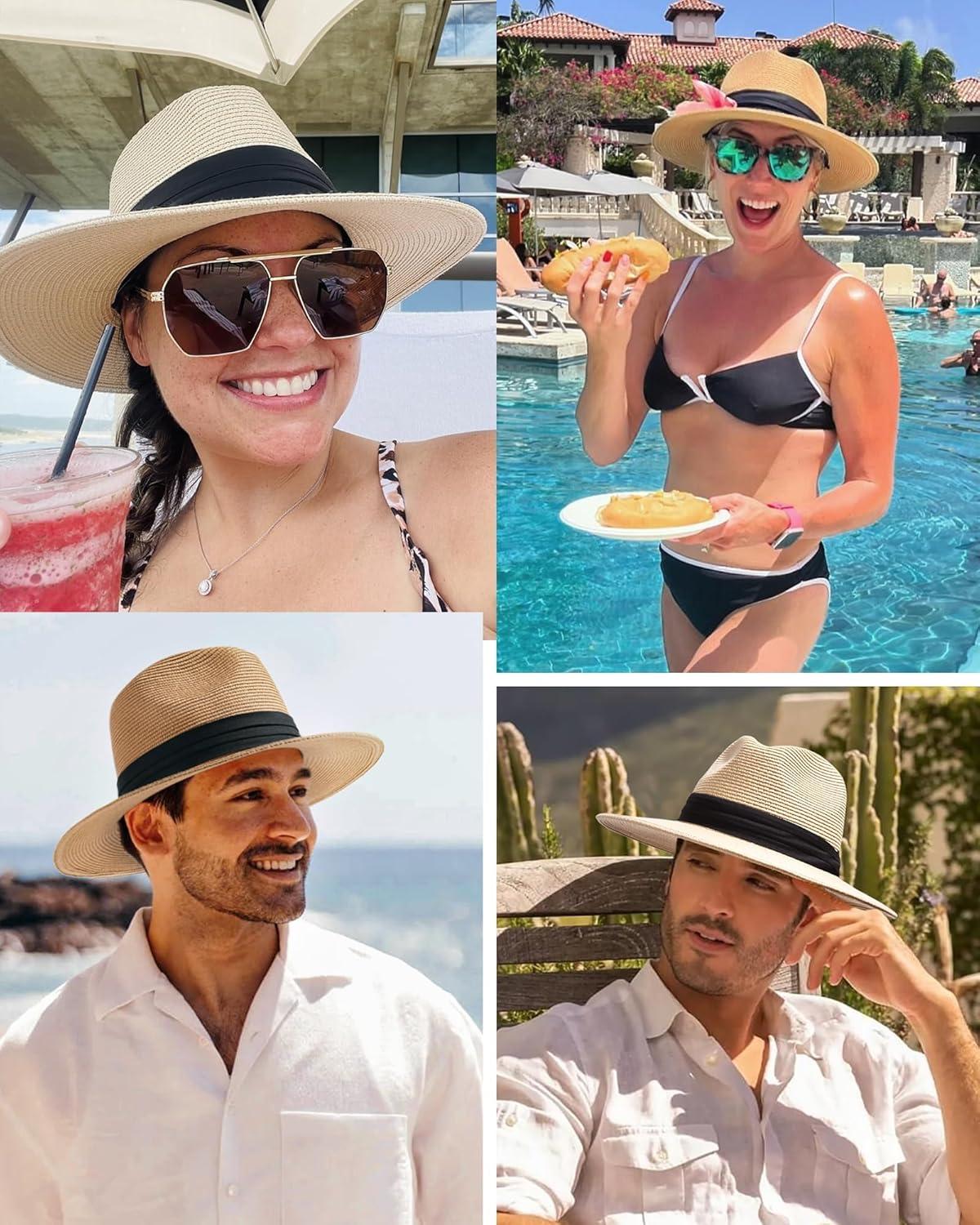 FURTALK Panama Hat Sun Hats for Women Men Wide Brim Fedora Straw Beach Hat UV UPF 80+(Black-beige)
