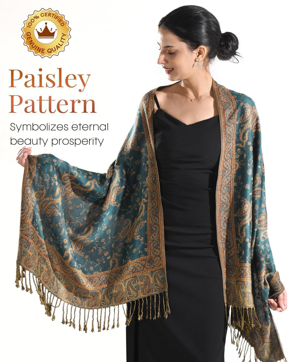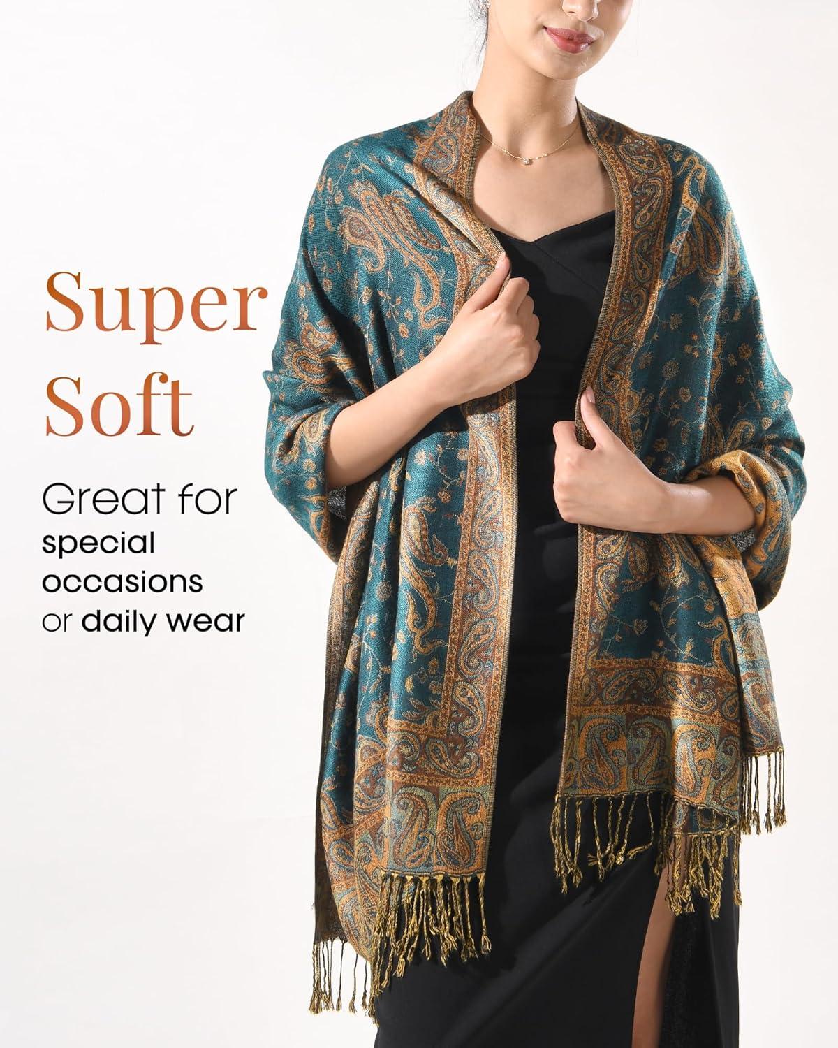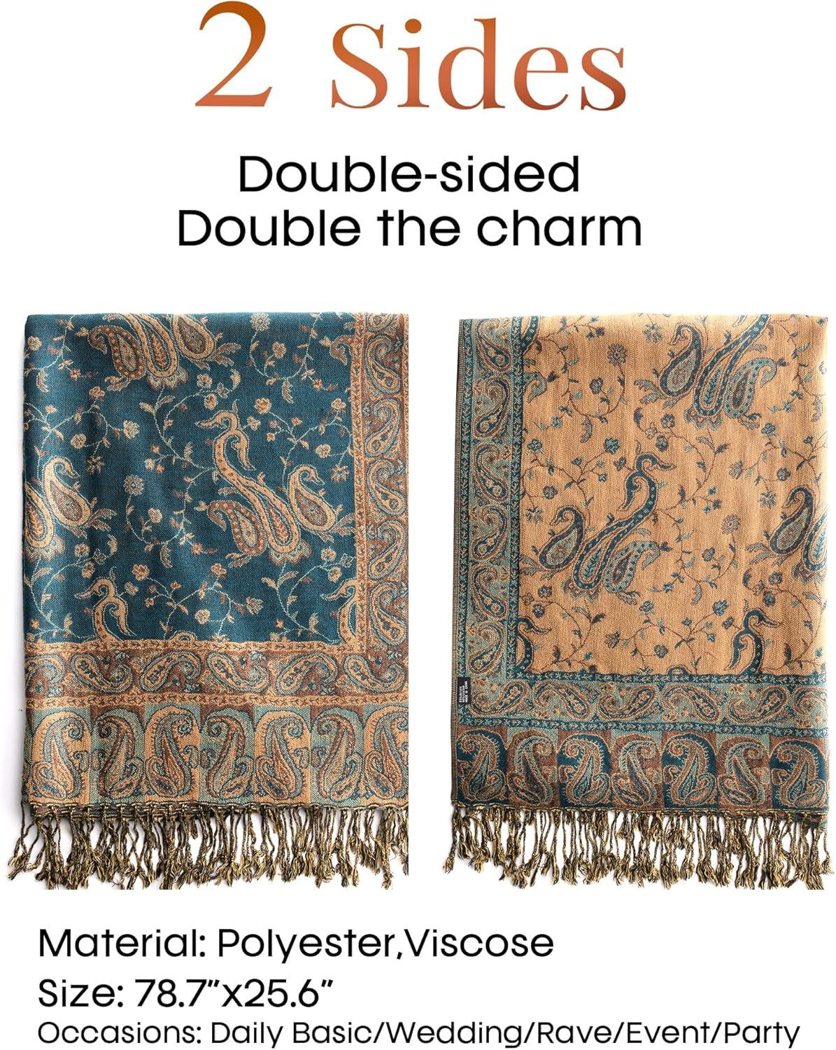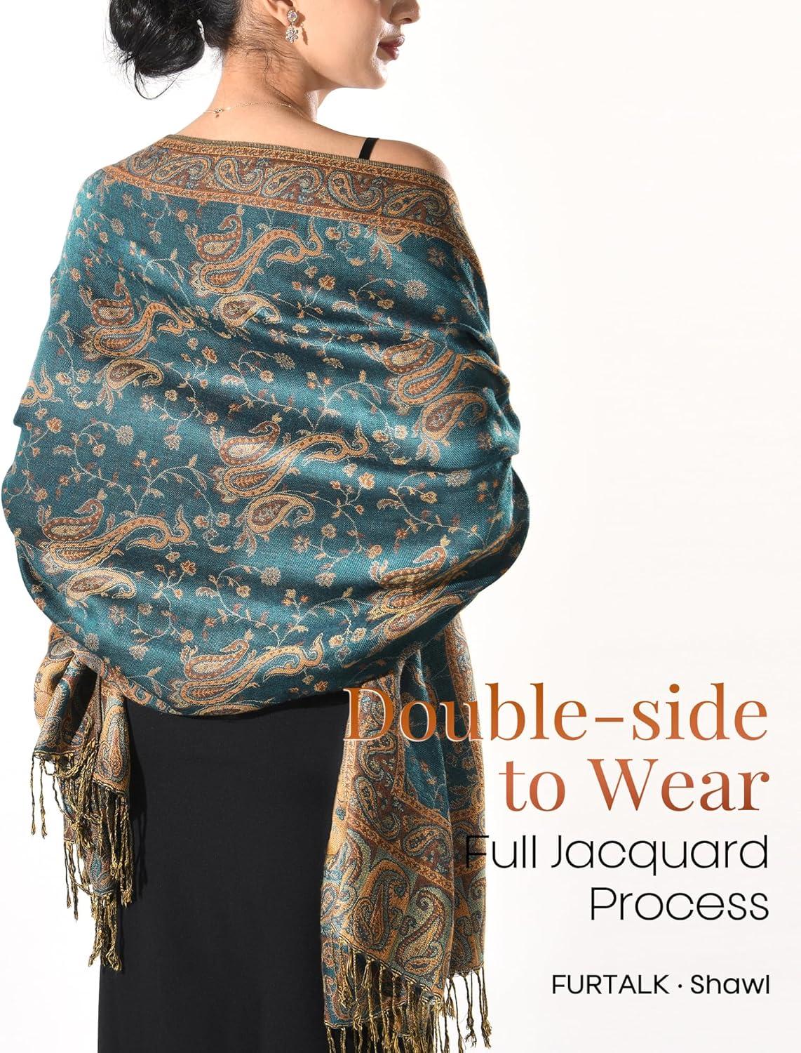 FURTALK Reversible Paisley Pashmina Shawl Wraps for Women Soft Exotic Indian Rave Scarf for Evening Dress Festival Scarves(Emerald Blue)