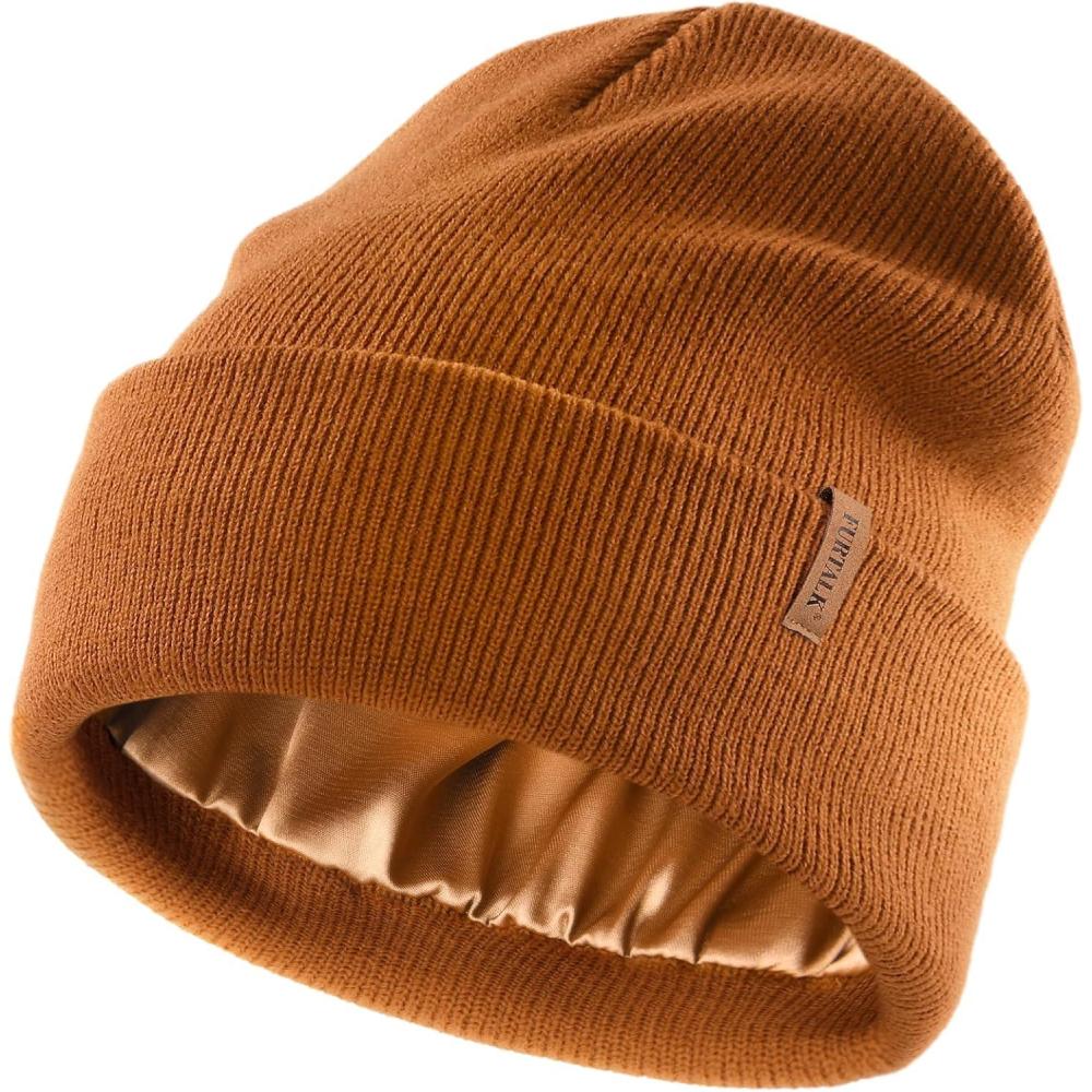 imageFURTALK Satin Lined Beanie for Women Men Knit Beanie Hat Acrylic Winter Hats Warm Slouchy Skull CapCaramel