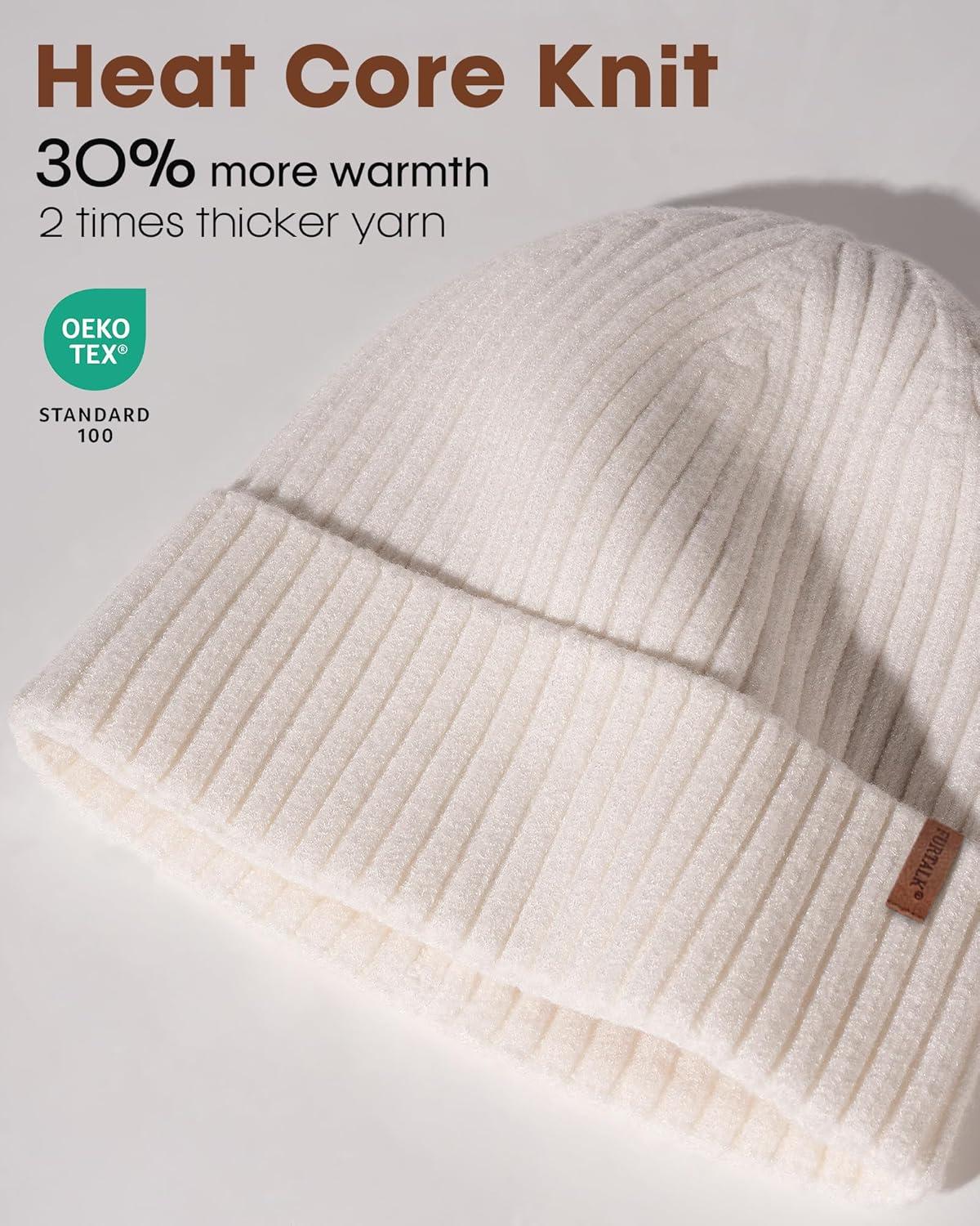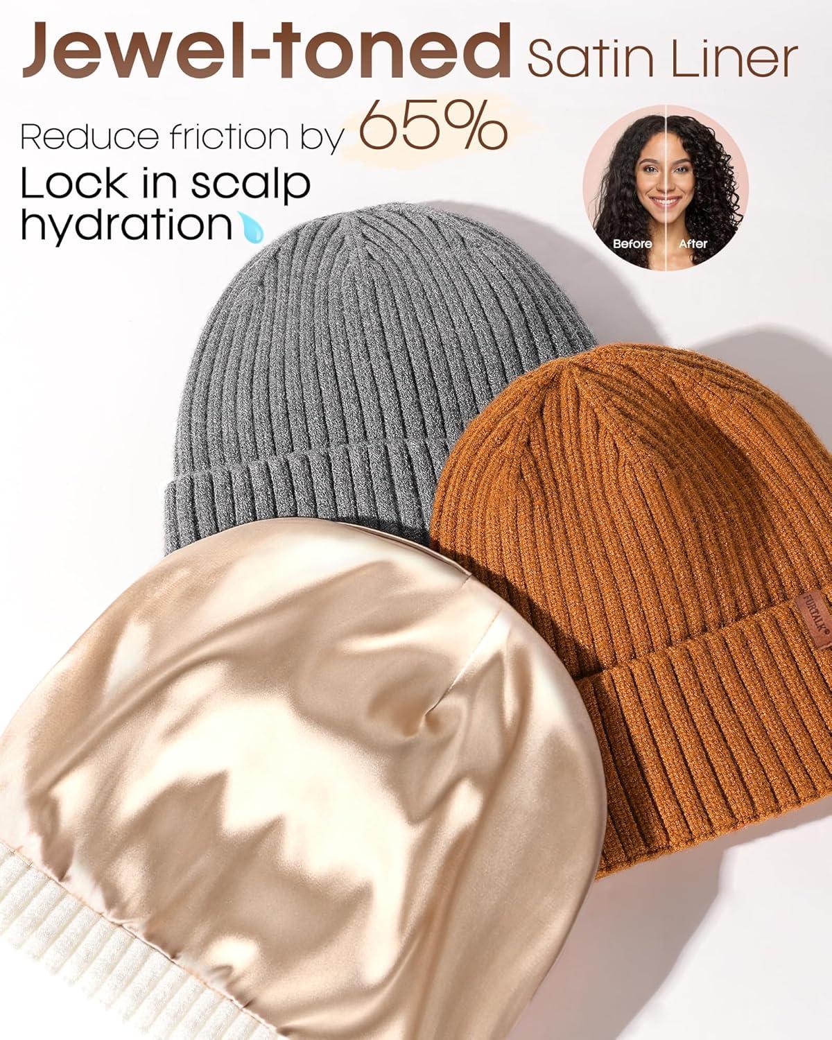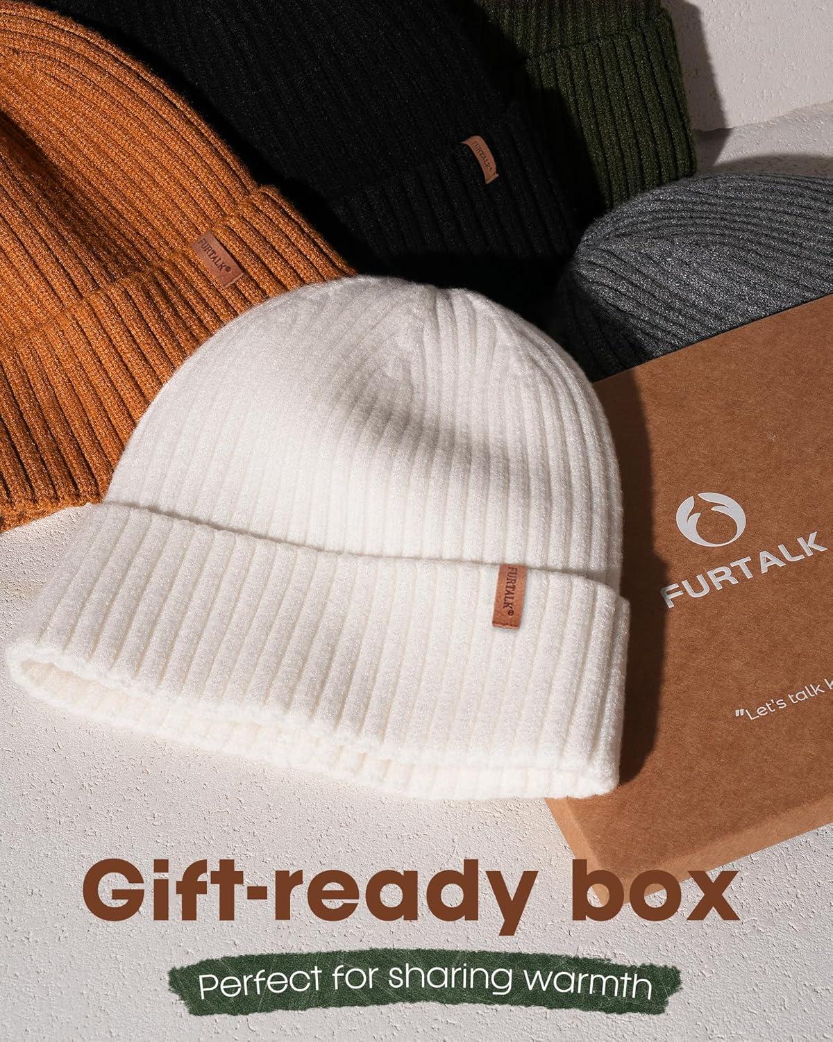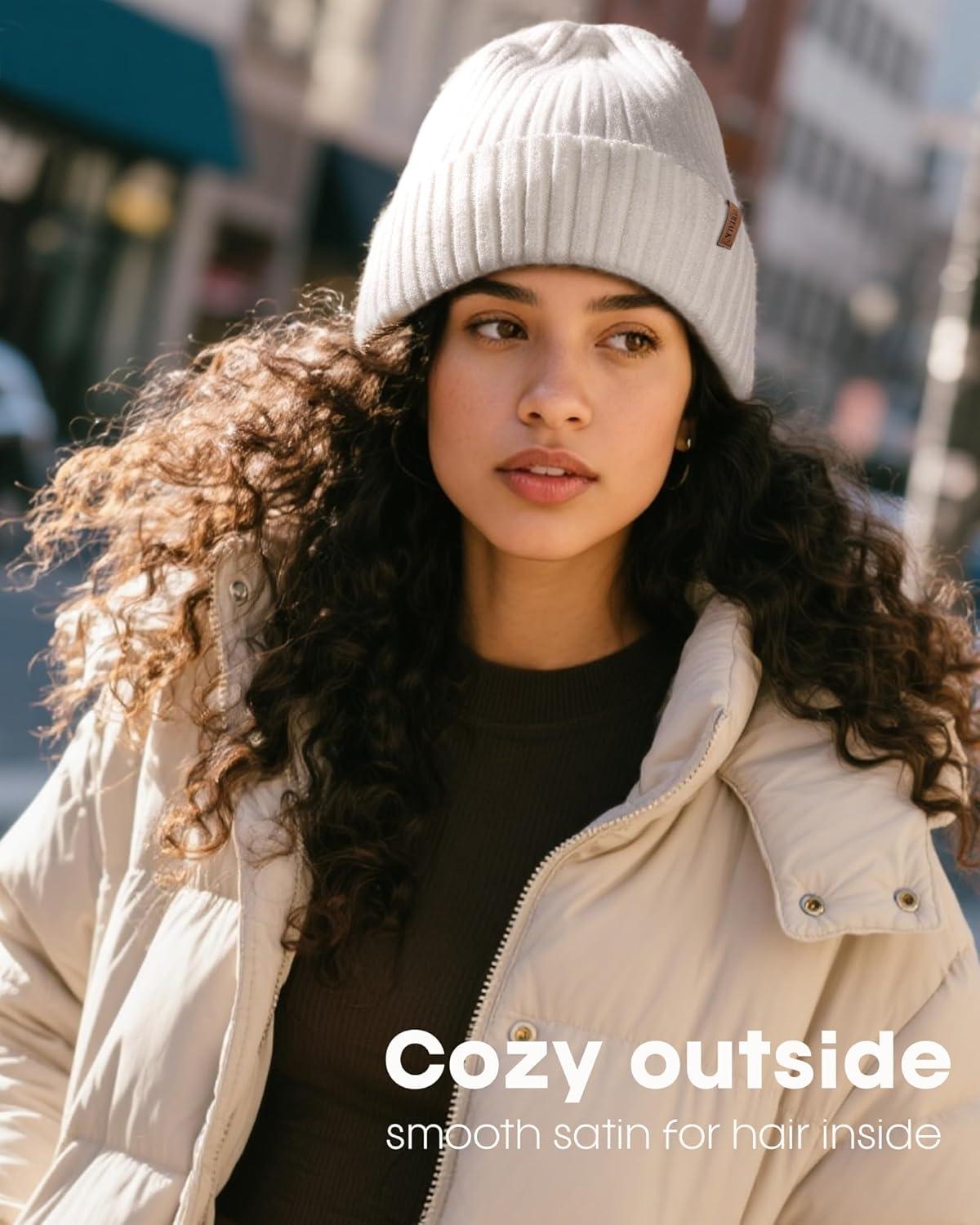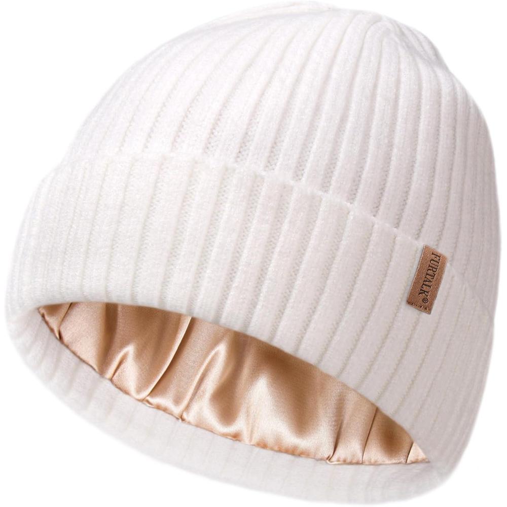 imageFURTALK Satin Lined Knit Beanie for Men Women Winter Hats Silk Lining Slouchy Warm Cuffed CapWhite