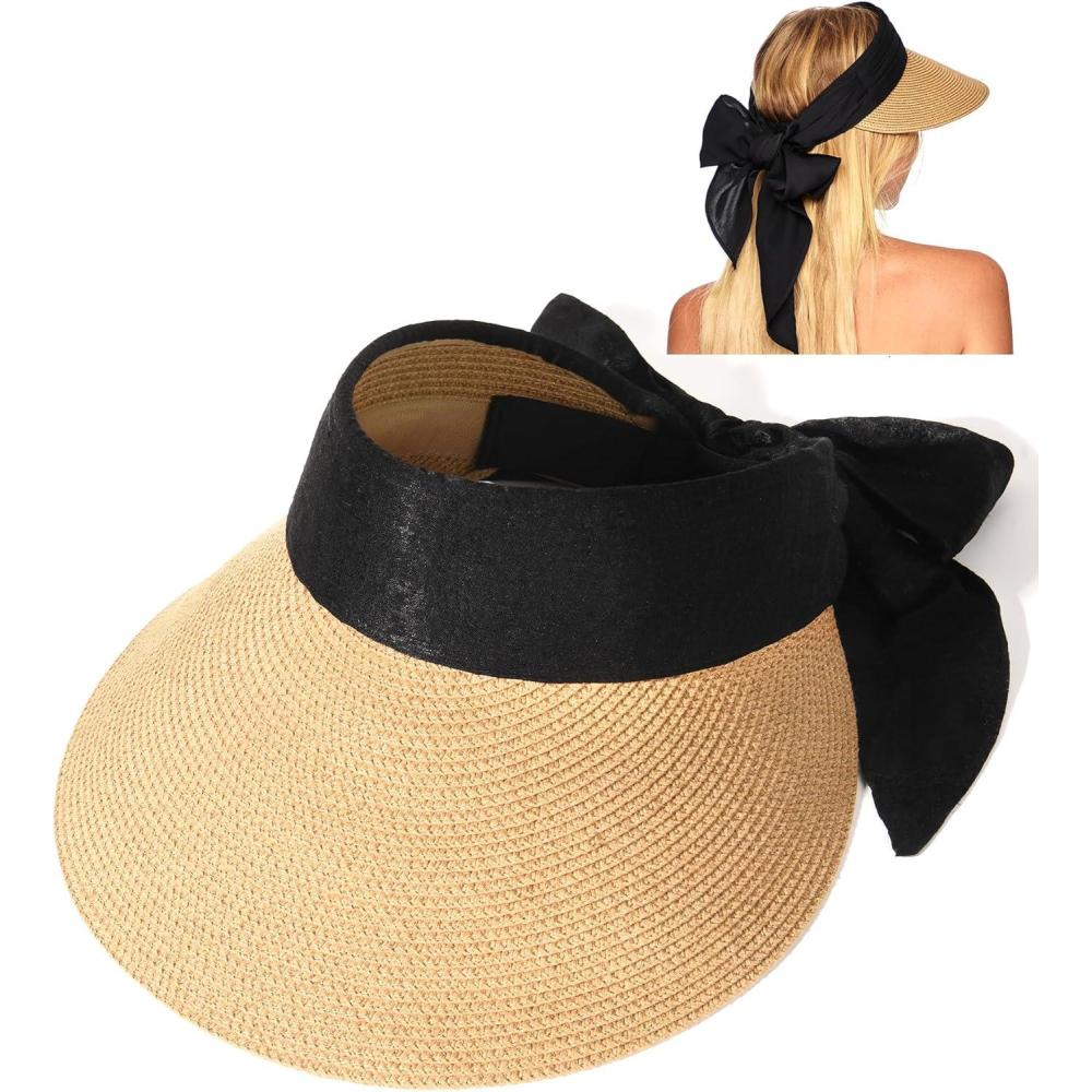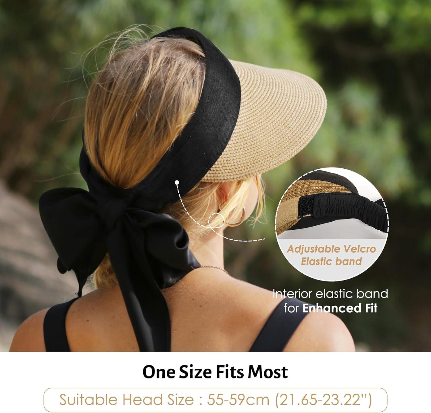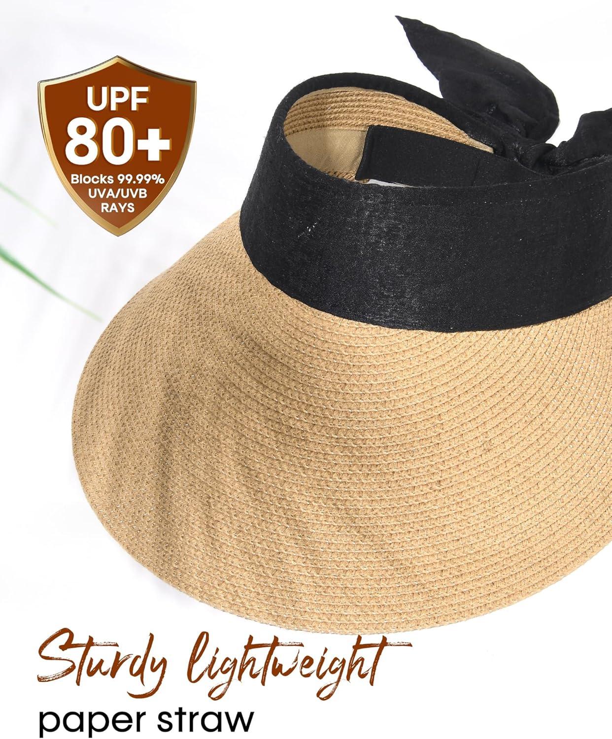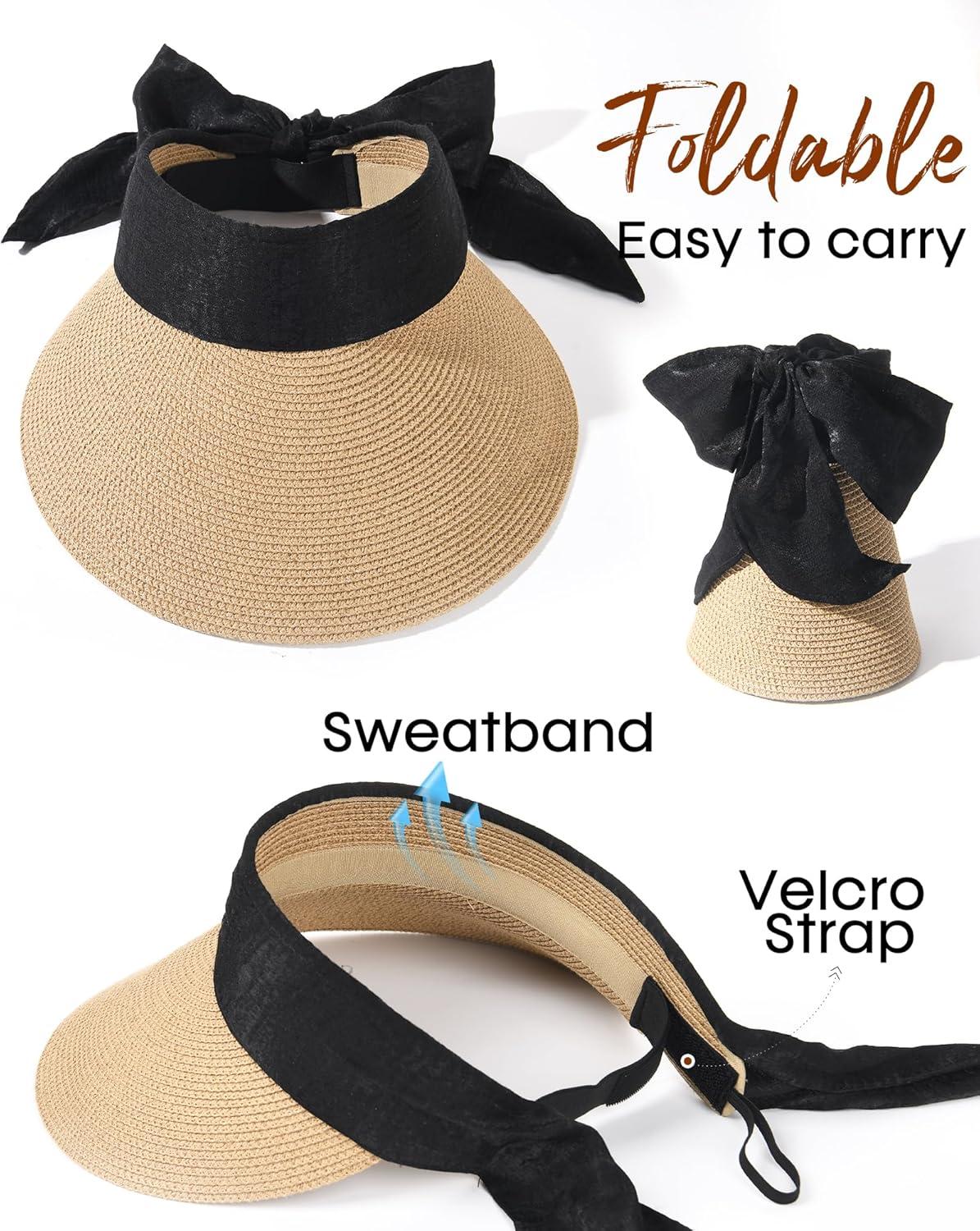 FURTALK Straw Sun Visor Hats for Women Summer Beach Sun Hat Packable UPF 80 Sun Protection Travel Hat with Big Tie