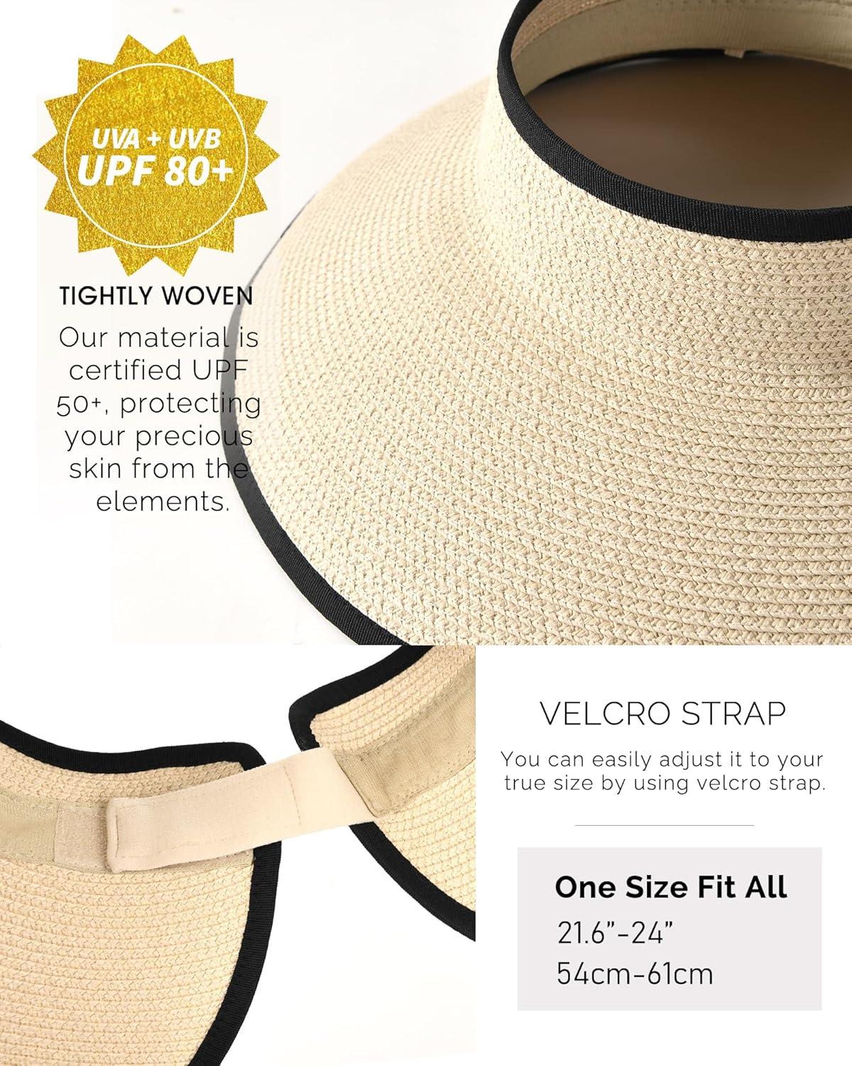 FURTALK Sun Hats for Women Wide Brim Beach Hat Straw Visor Ponytail Summer UV Packable Foldable Beach Vacation Essentials(Beige With Black)