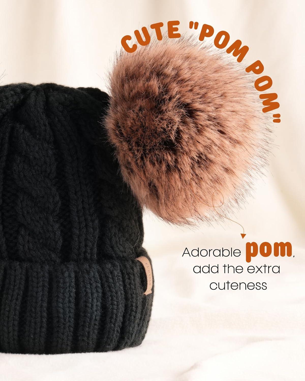 FURTALK Toddler Warm Winter Hat Kids Baby Knitted Soft Beanie with Double Faux Fur Pom Poms for Girls Boys(Black)