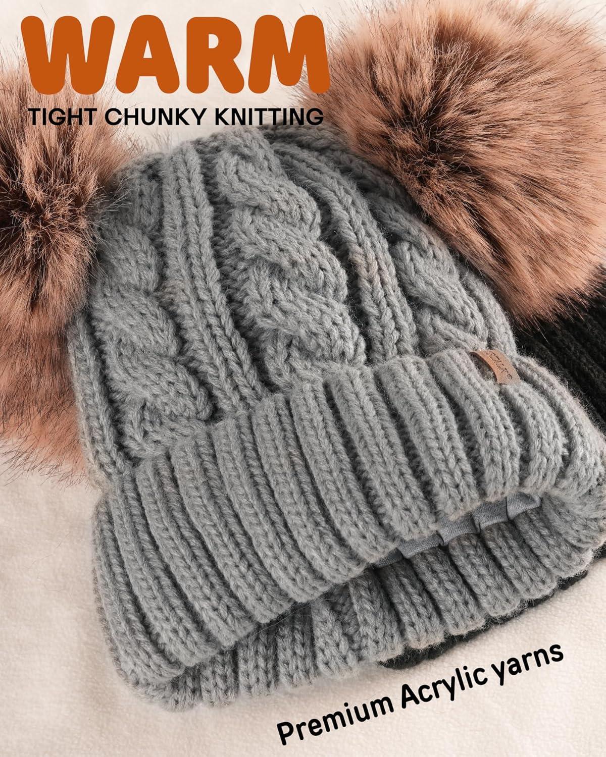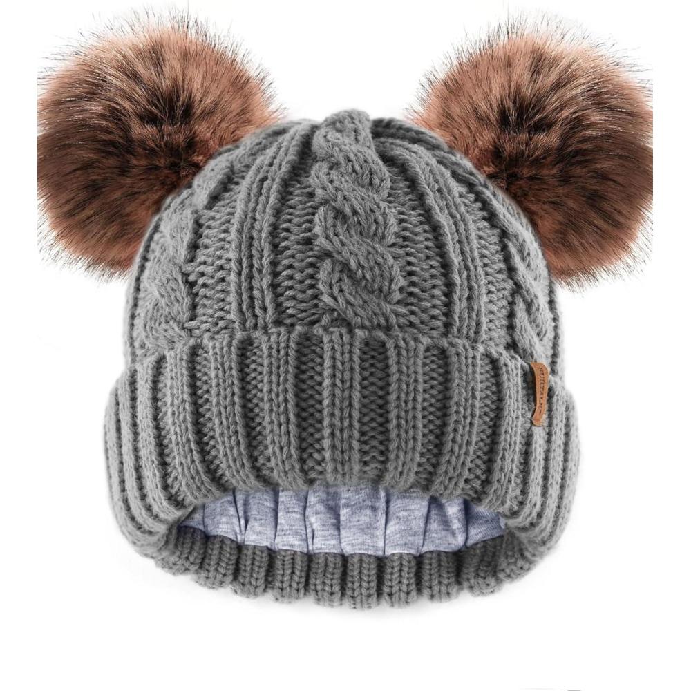 imageFURTALK Toddler Warm Winter Hat Kids Baby Knitted Soft Beanie with Double Faux Fur Pom Poms for Girls BoysGrey