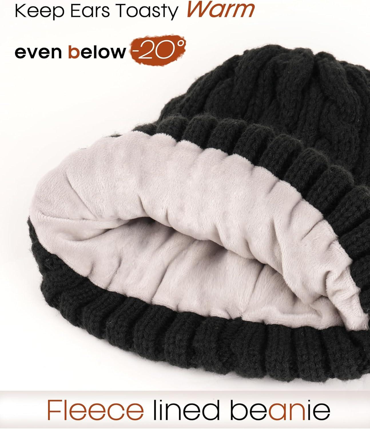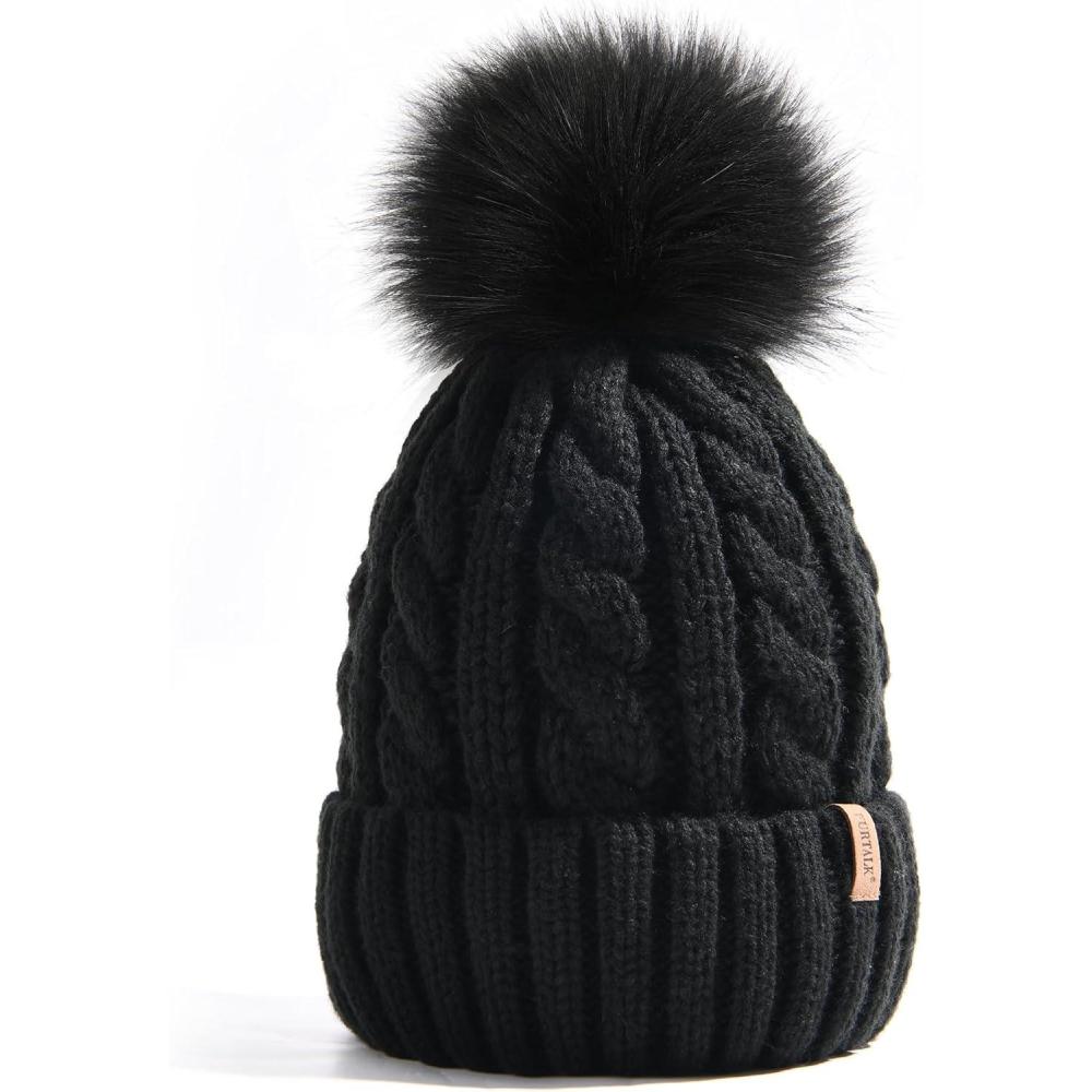 FURTALK Winter Beanie Knit Hat for Women Warm Fleece Lined with Faux Fur Pom Poms Womens Thick Ski Hats Knitted Skull Cap(Black With Black Pom)