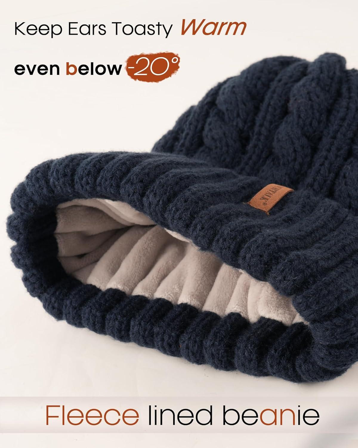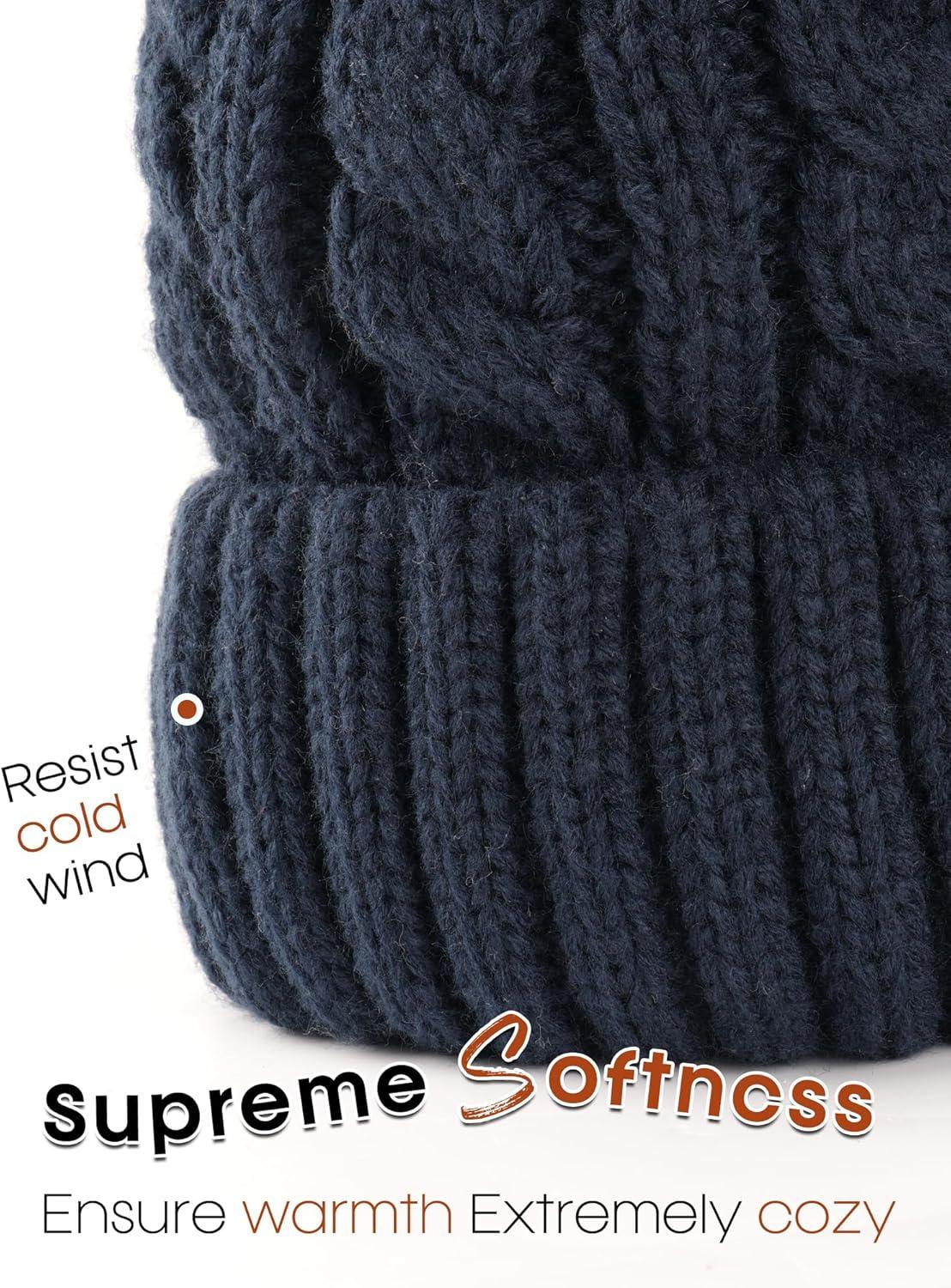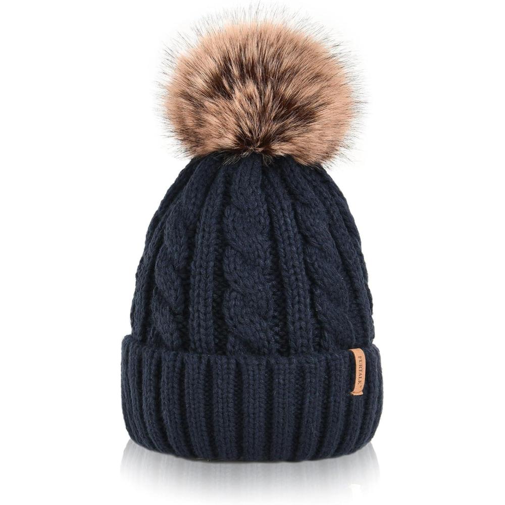 FURTALK Winter Beanie Knit Hat for Women Warm Fleece Lined with Faux Fur Pom Poms Womens Thick Ski Hats Knitted Skull Cap(Dark Blue)