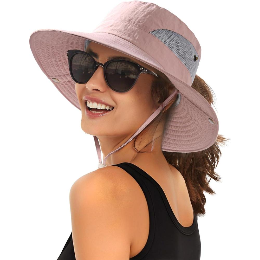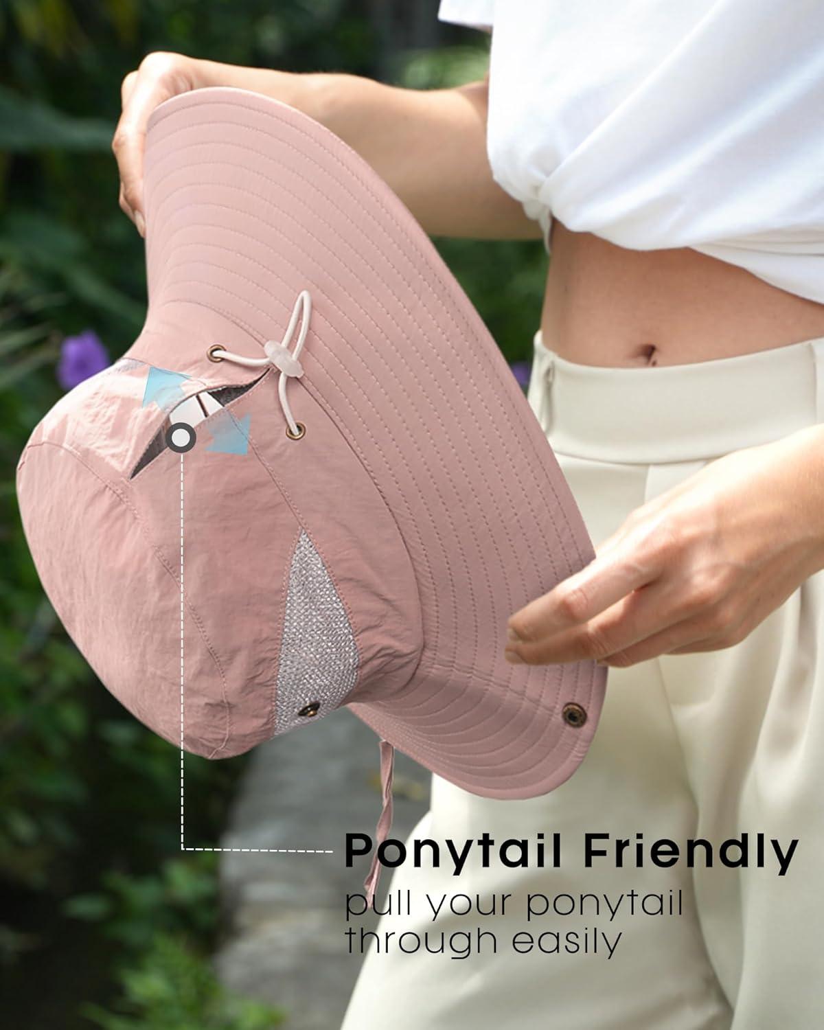 FURTALK Womens Sun Hat with Ponytail Hole Beach Hiking Summer Wide Brim UPF 80+ Outdoor Protection Foldable Bucket Hat(Pink)