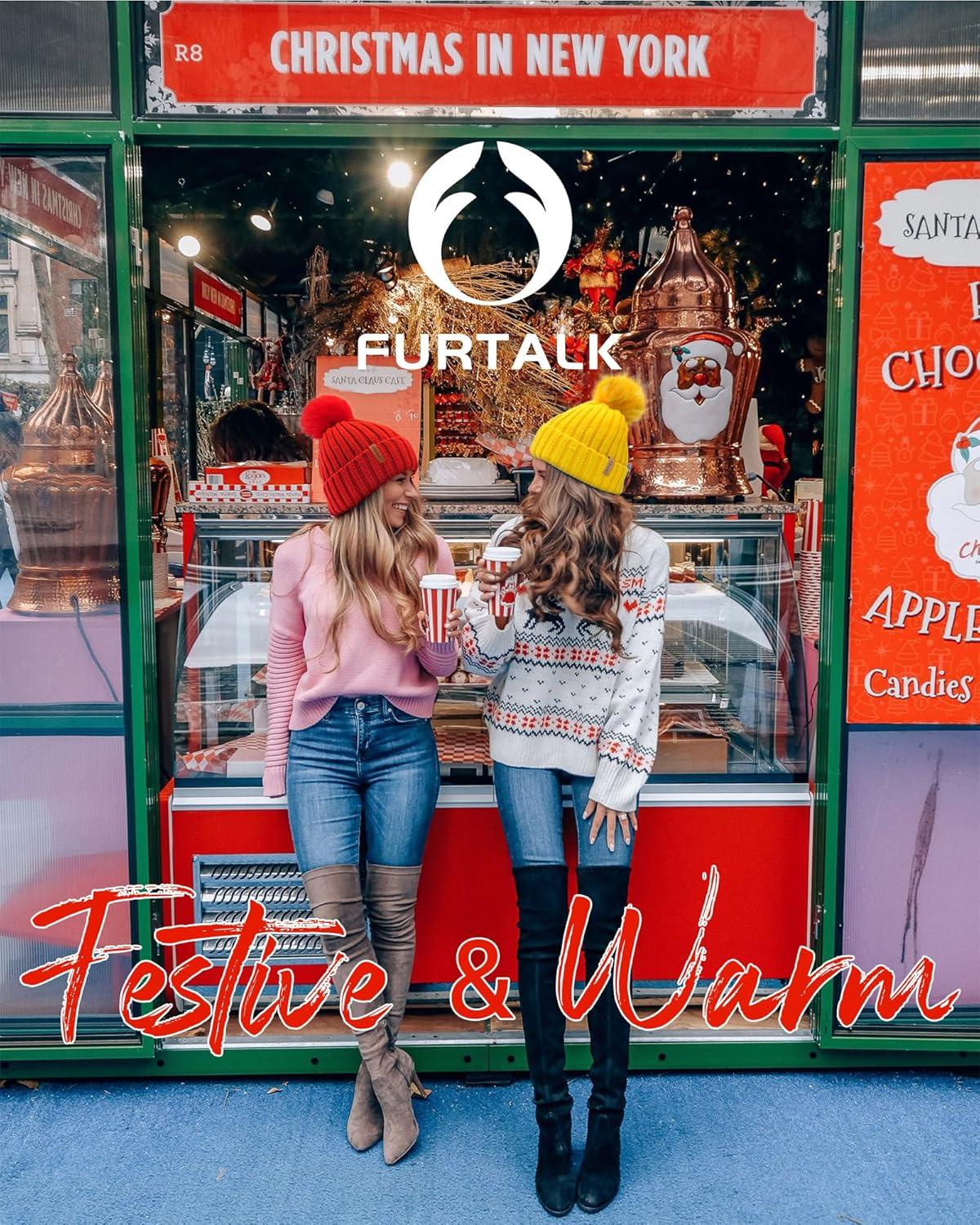 FURTALK Womens Winter Beanie Hat Satin Lined Faux Fur Pom Pom Beanies Hat for Women Winter Warm Knit Hats(Wine Red)