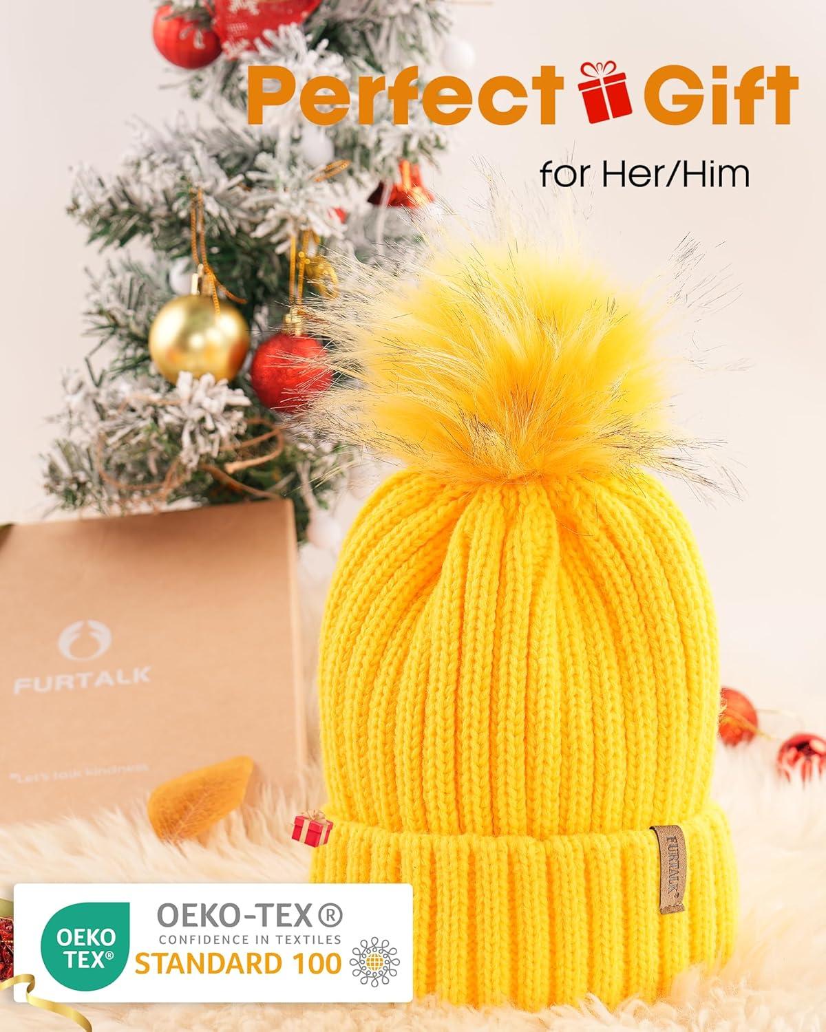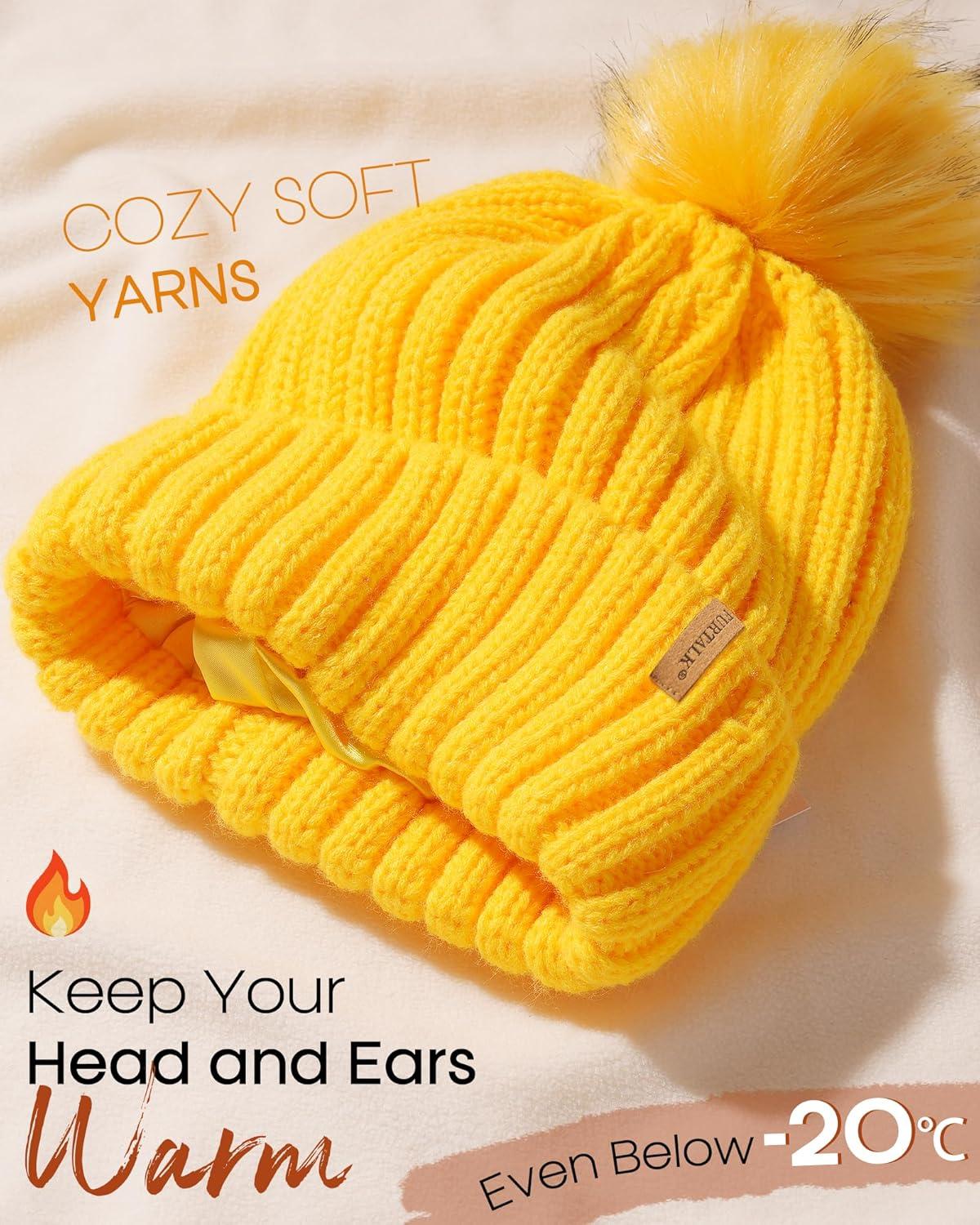 FURTALK Womens Winter Beanie Hat Satin Lined Faux Fur Pom Pom Beanies Hat for Women Winter Warm Knit Hats(Yellow)